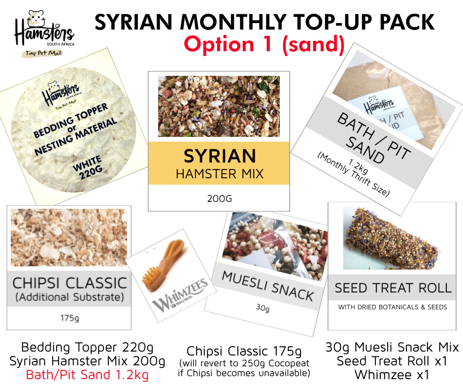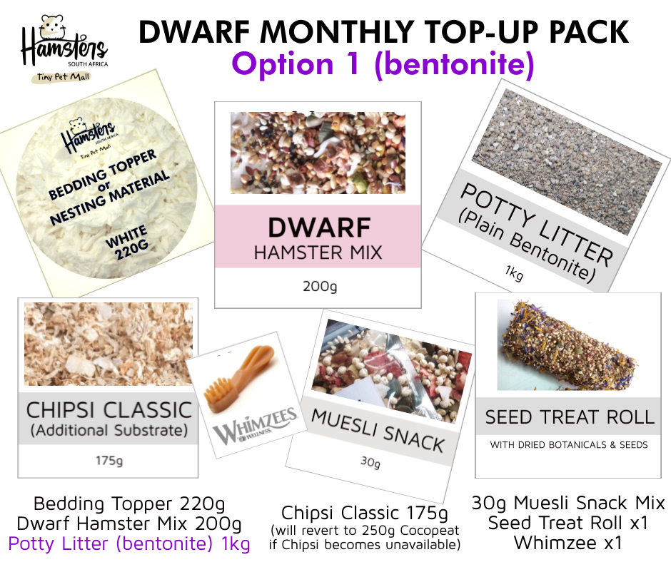 There are two options for DWARF hamsters (where you may be using either bentonite or sand in the potty) and the pack contains the following: