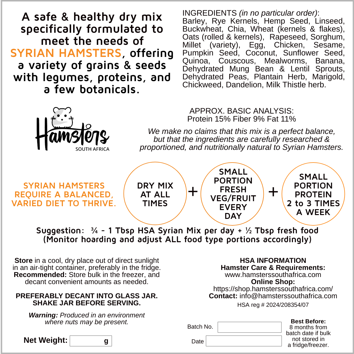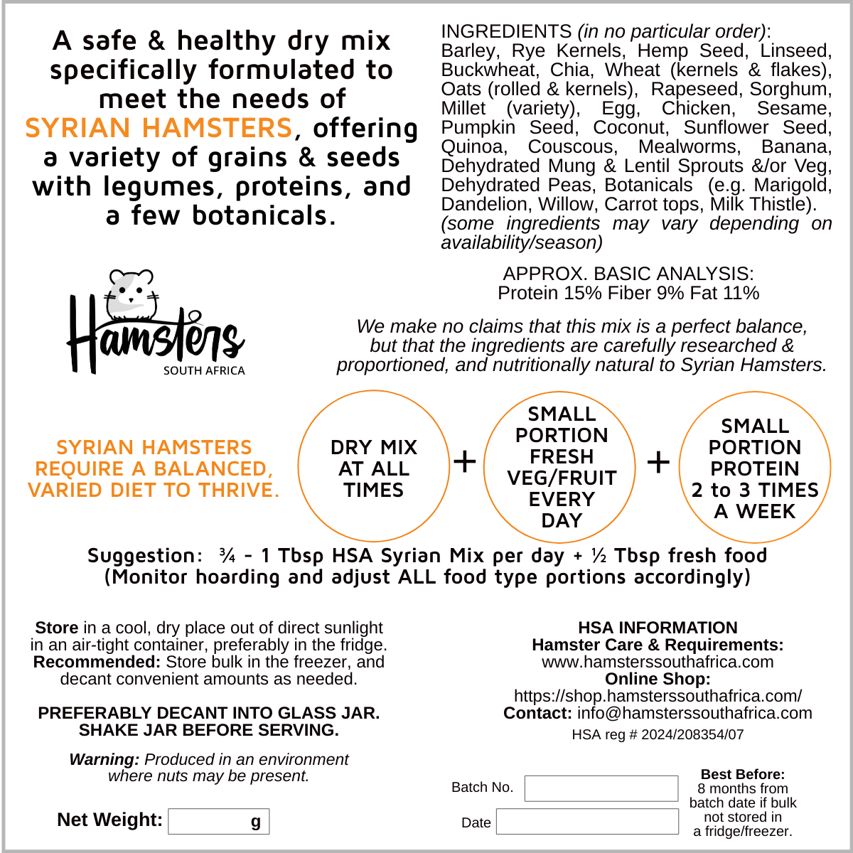 We make no claims that this mix is an absolute perfect balance, but that the ingredients are carefully researched & proportioned, and nutritionally natural to Syrian Hamsters.